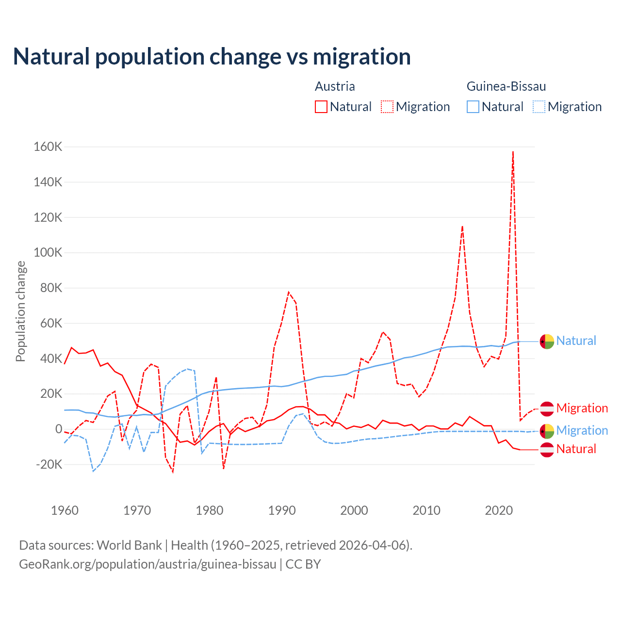 Over the last 10 years, 2.61% of the population change in Austria is from natural causes (a loss of 16,936 people) and 97.4% is from migration (a gain of 631,325 people). In Guinea-Bissau 97.1% is from natural causes (a gain of 472,826 people) and 2.87% is from migration (a loss of 13,956 people).