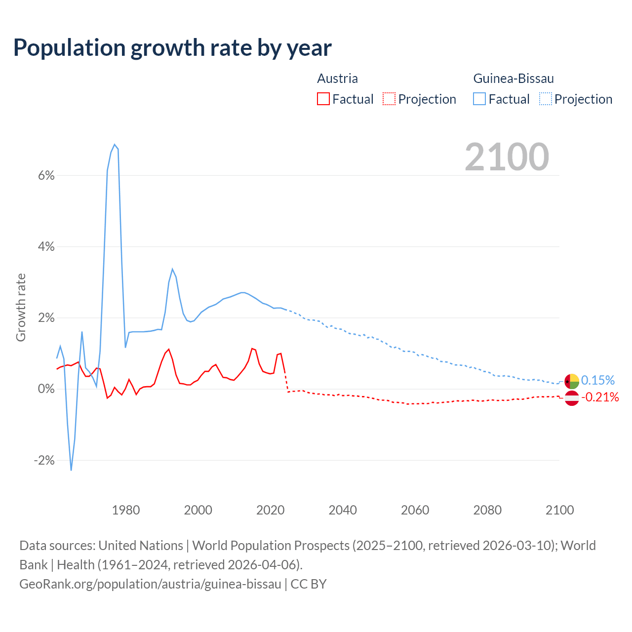 - For the last 10 years, Austria has had an average growth rate of +0.72% per year vs +2.4% in Guinea-Bissau.