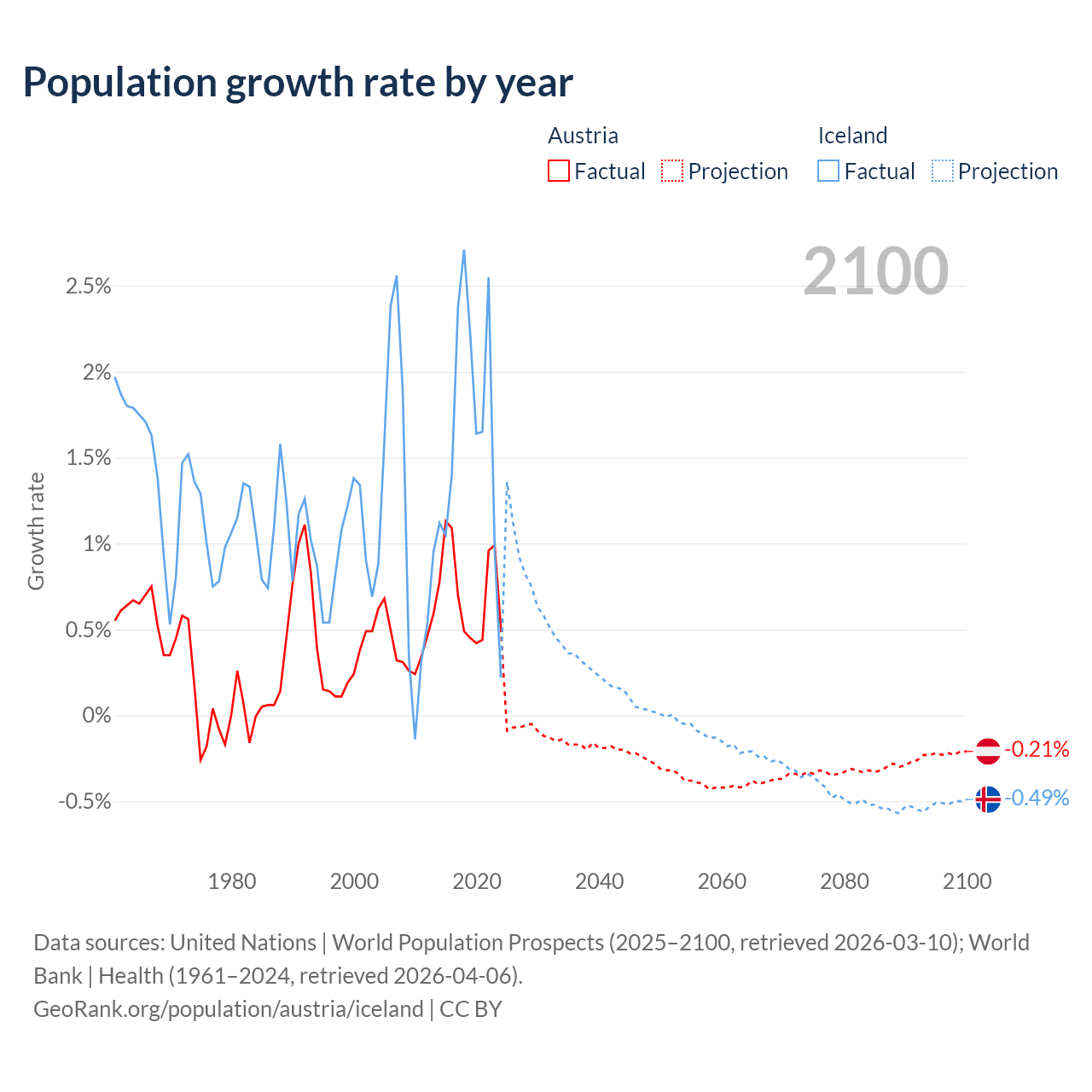 - For the last 10 years, Austria has had an average growth rate of +0.72% per year vs +1.63% in Iceland.