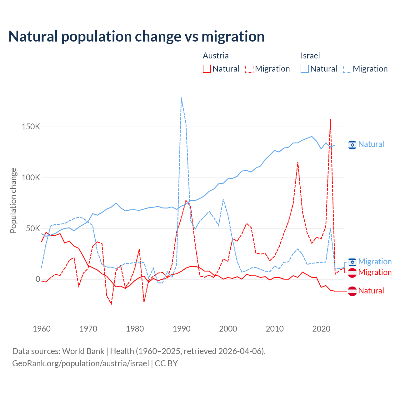 Over the last 10 years, 2.61% of the population change in Austria is from natural causes (a loss of 16,936 people) and 97.4% is from migration (a gain of 631,325 people). In Israel 86% is from natural causes (a gain of 1,343,492 people) and 14% is from migration (a gain of 219,048 people).