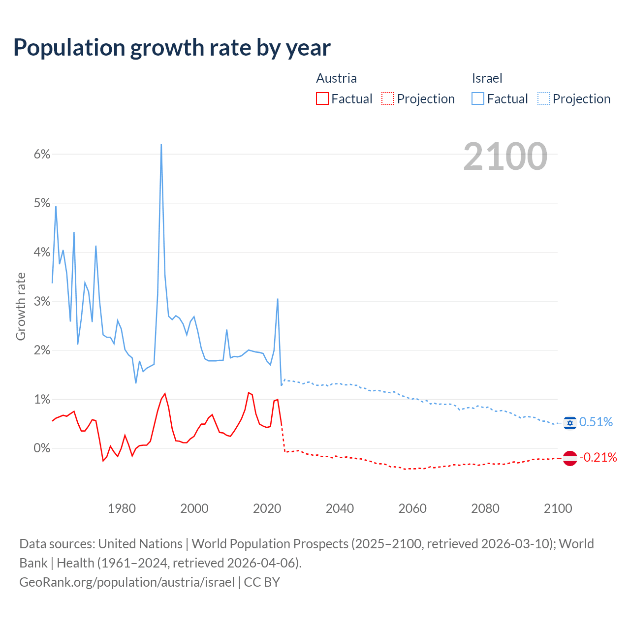 - For the last 10 years, Austria has had an average growth rate of +0.72% per year vs +1.96% in Israel.