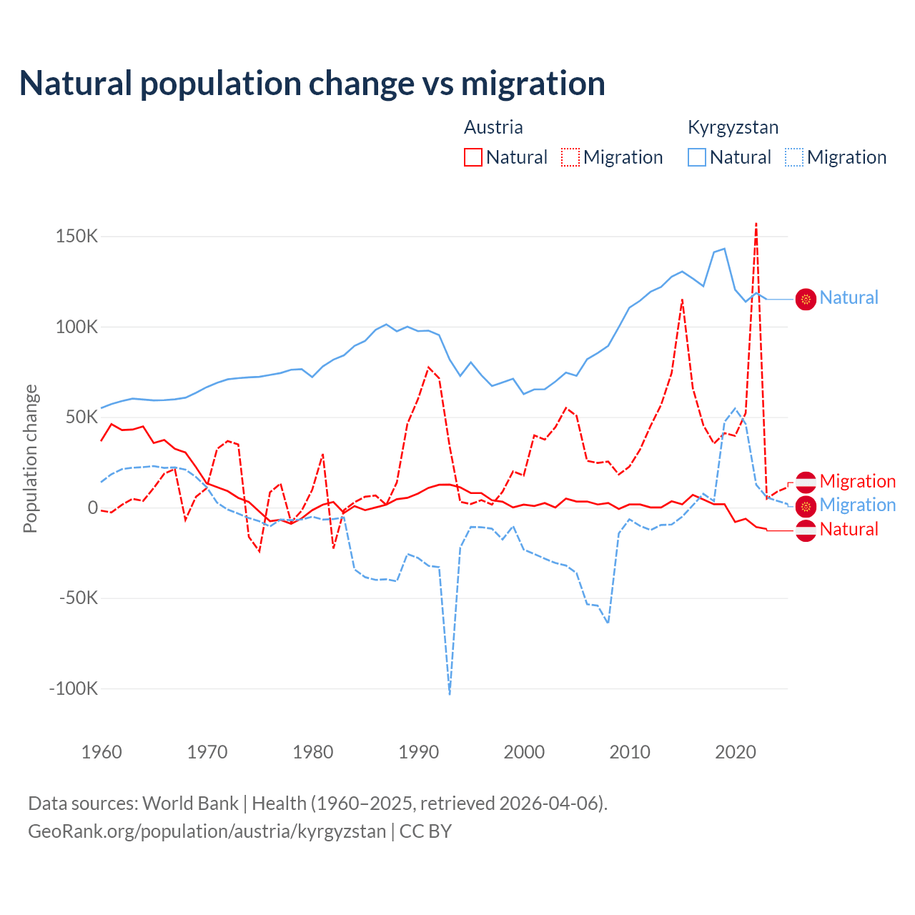 Over the last 10 years, 2.61% of the population change in Austria is from natural causes (a loss of 16,936 people) and 97.4% is from migration (a gain of 631,325 people). In Kyrgyzstan 88.5% is from natural causes (a gain of 1,258,837 people) and 11.5% is from migration (a gain of 164,132 people).