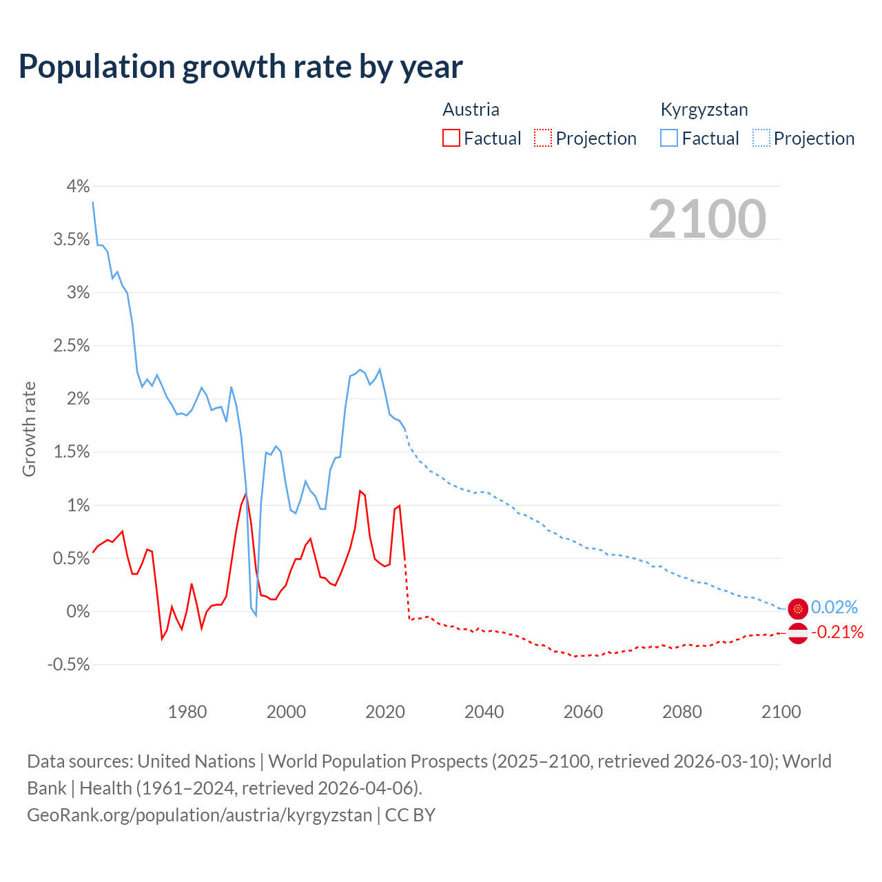 - For the last 10 years, Austria has had an average growth rate of +0.72% per year vs +2.05% in Kyrgyzstan.