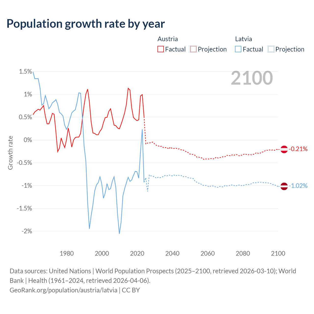 - For the last 10 years, Austria has had an average growth rate of +0.72% per year vs -0.68% in Latvia.