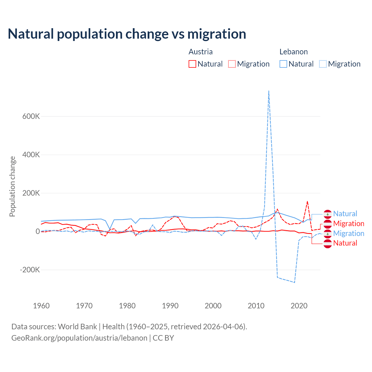Over the last 10 years, 2.61% of the population change in Austria is from natural causes (a loss of 16,936 people) and 97.4% is from migration (a gain of 631,325 people). In Lebanon 40.1% is from natural causes (a gain of 739,256 people) and 59.9% is from migration (a loss of 1,103,772 people).