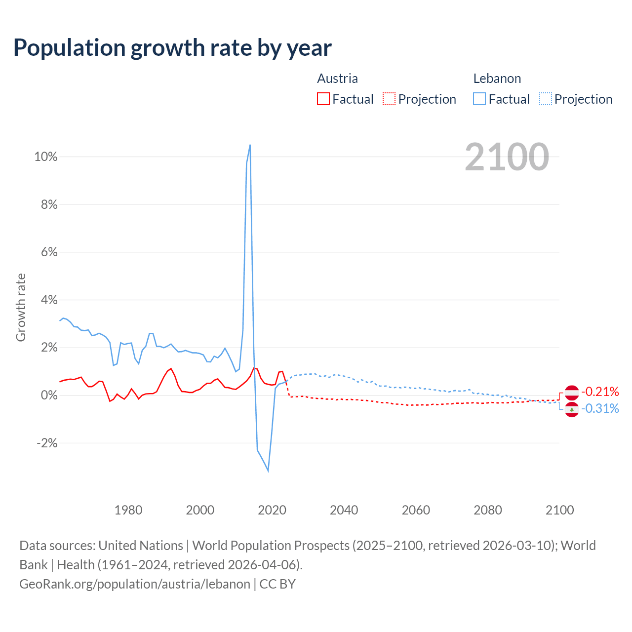 - For the last 10 years, Austria has had an average growth rate of +0.72% per year vs +0.16% in Lebanon.