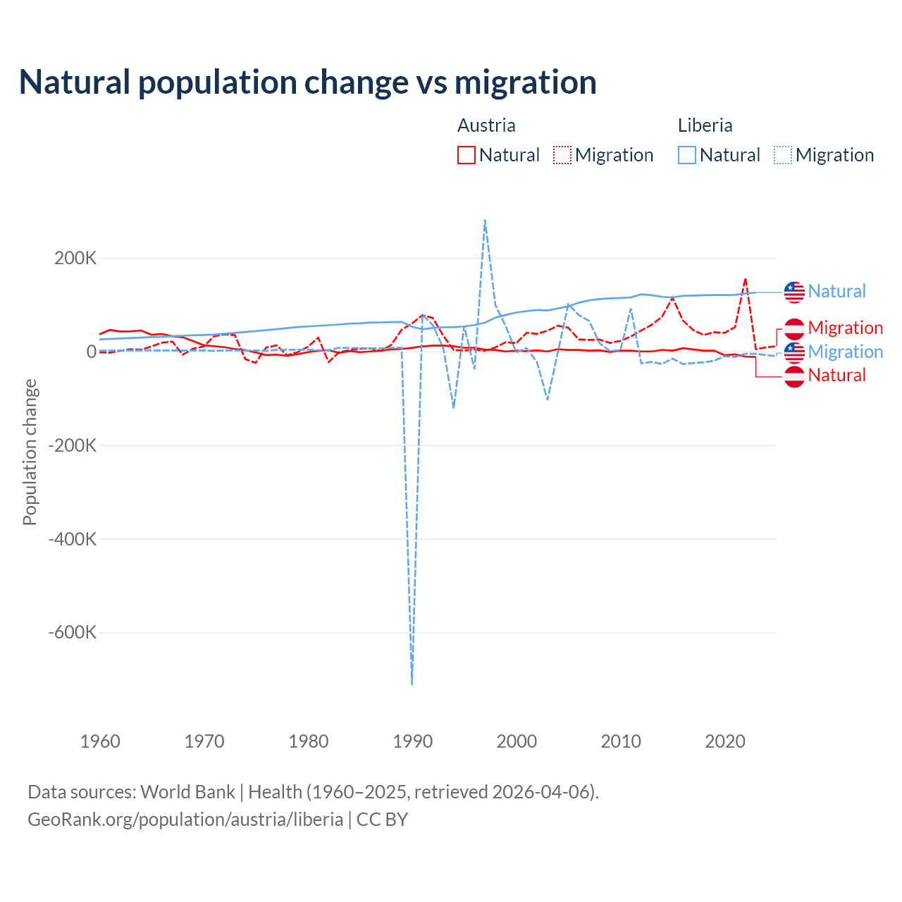 Over the last 10 years, 2.61% of the population change in Austria is from natural causes (a loss of 16,936 people) and 97.4% is from migration (a gain of 631,325 people). In Liberia 87.7% is from natural causes (a gain of 1,202,387 people) and 12.3% is from migration (a loss of 168,316 people).