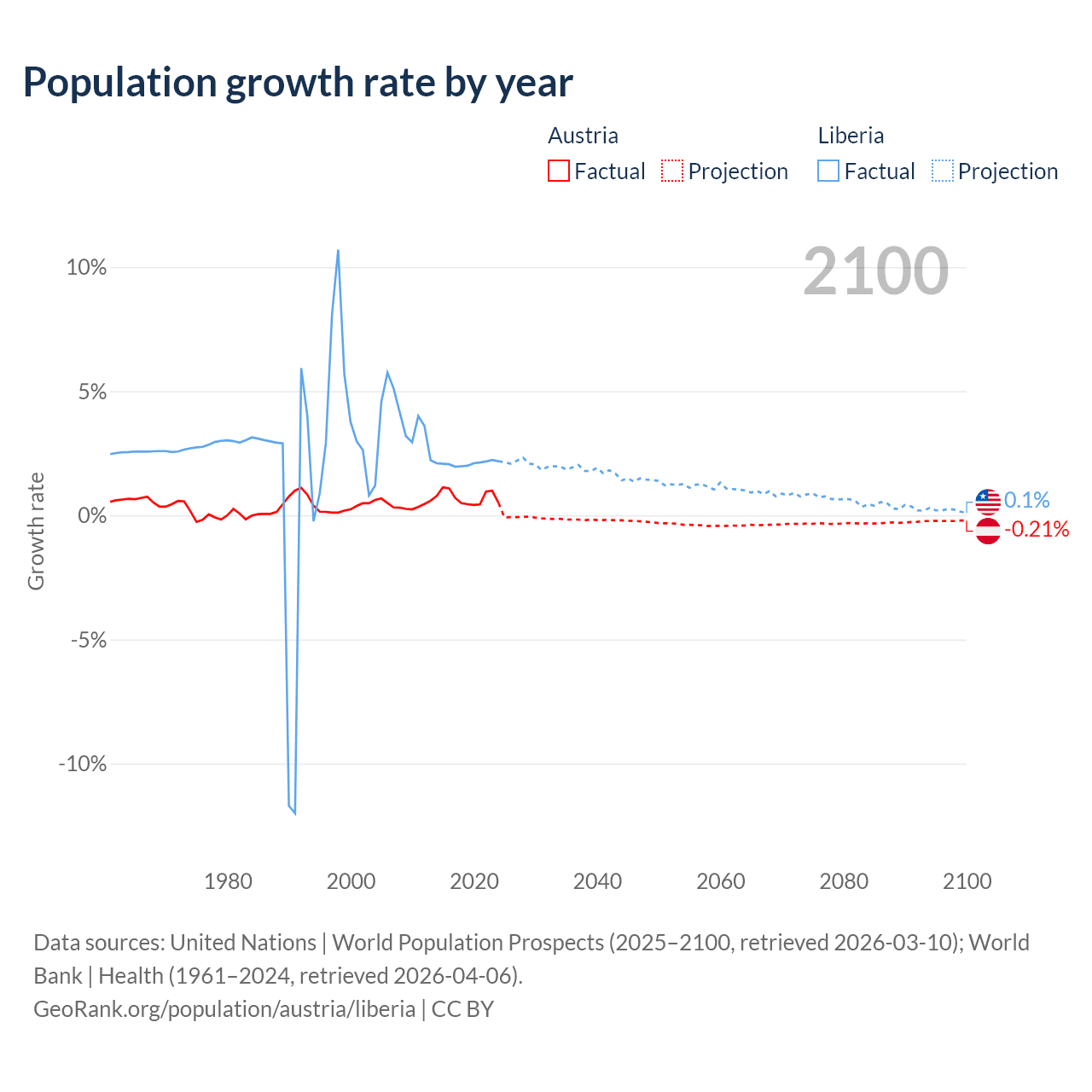 - For the last 10 years, Austria has had an average growth rate of +0.72% per year vs +2.09% in Liberia.