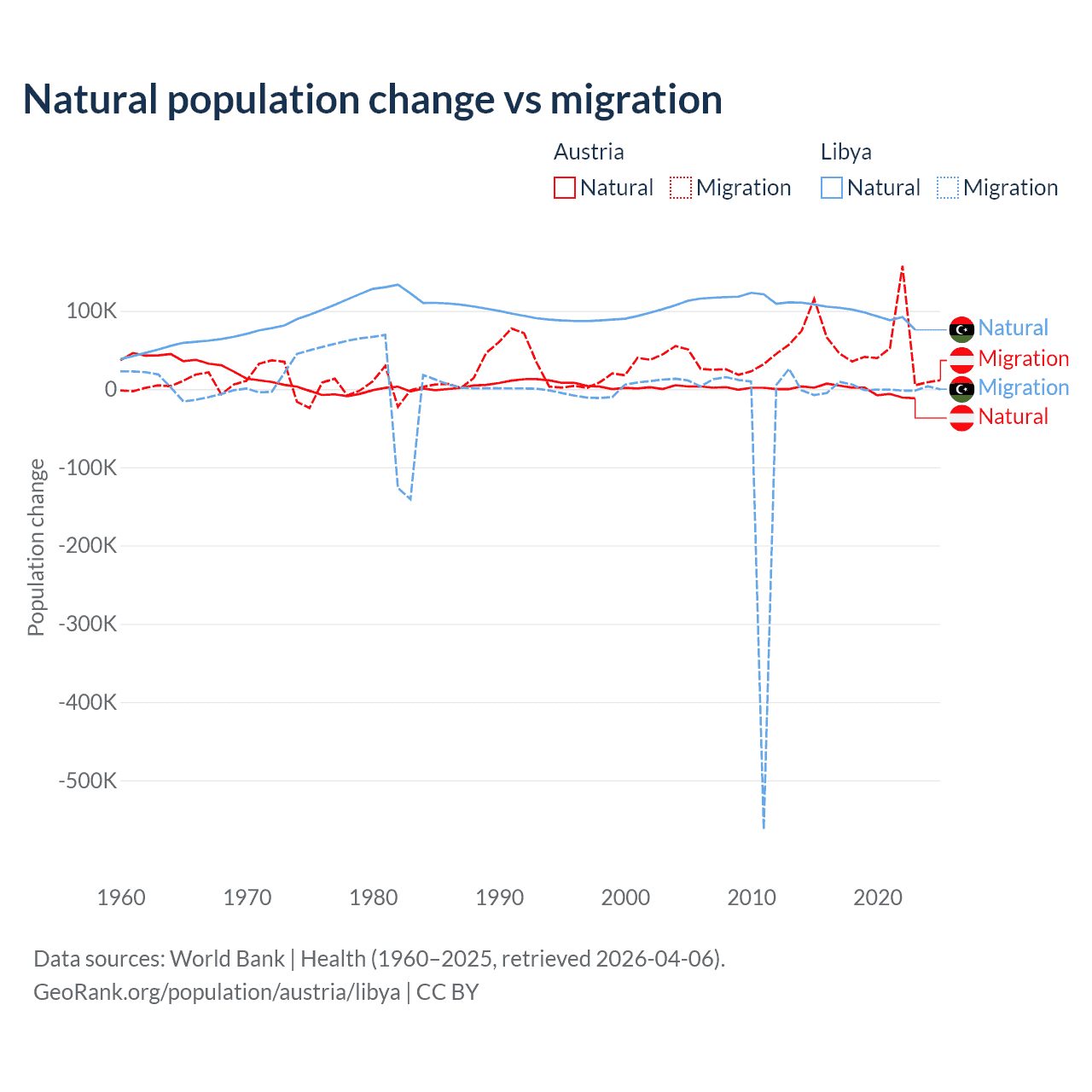 Over the last 10 years, 2.61% of the population change in Austria is from natural causes (a loss of 16,936 people) and 97.4% is from migration (a gain of 631,325 people). In Libya 99.4% is from natural causes (a gain of 975,799 people) and 0.63% is from migration (a loss of 6,150 people).