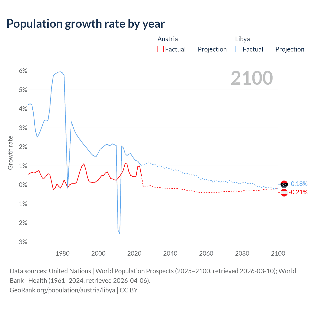 - For the last 10 years, Austria has had an average growth rate of +0.72% per year vs +1.44% in Libya.