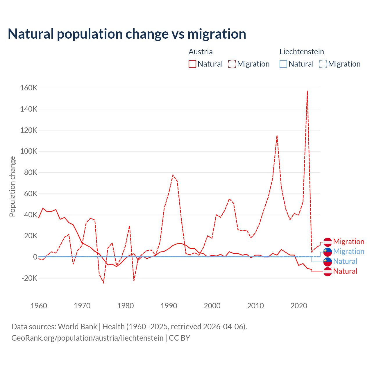 Over the last 10 years, 2.61% of the population change in Austria is from natural causes (a loss of 16,936 people) and 97.4% is from migration (a gain of 631,325 people). In Liechtenstein 32.4% is from natural causes (a gain of 883 people) and 67.6% is from migration (a gain of 1,843 people).