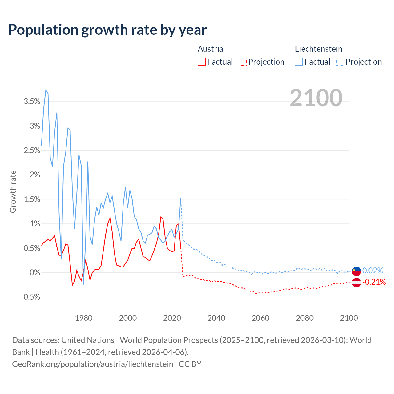 - For the last 10 years, Austria has had an average growth rate of +0.72% per year vs +0.82% in Liechtenstein.