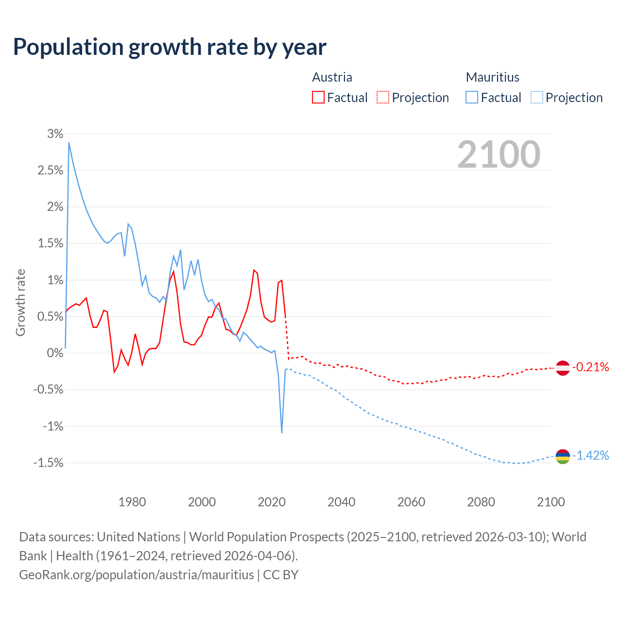 - For the last 10 years, Austria has had an average growth rate of +0.72% per year vs -0.09% in Mauritius.