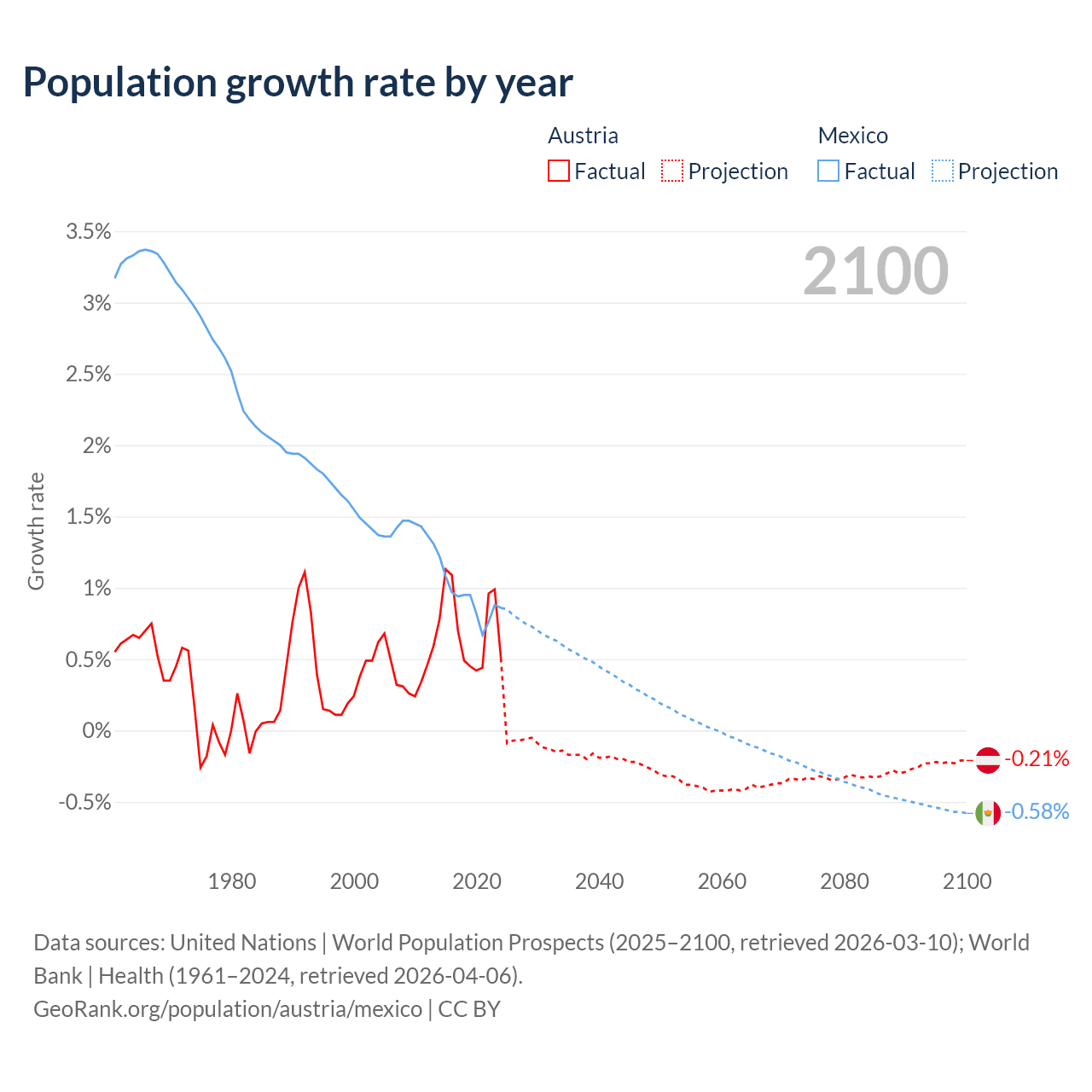 - For the last 10 years, Austria has had an average growth rate of +0.72% per year vs +0.92% in Mexico.