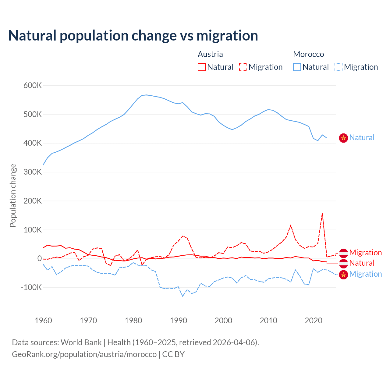 Over the last 10 years, 2.61% of the population change in Austria is from natural causes (a loss of 16,936 people) and 97.4% is from migration (a gain of 631,325 people). In Morocco 88.3% is from natural causes (a gain of 4,495,223 people) and 11.7% is from migration (a loss of 594,083 people).