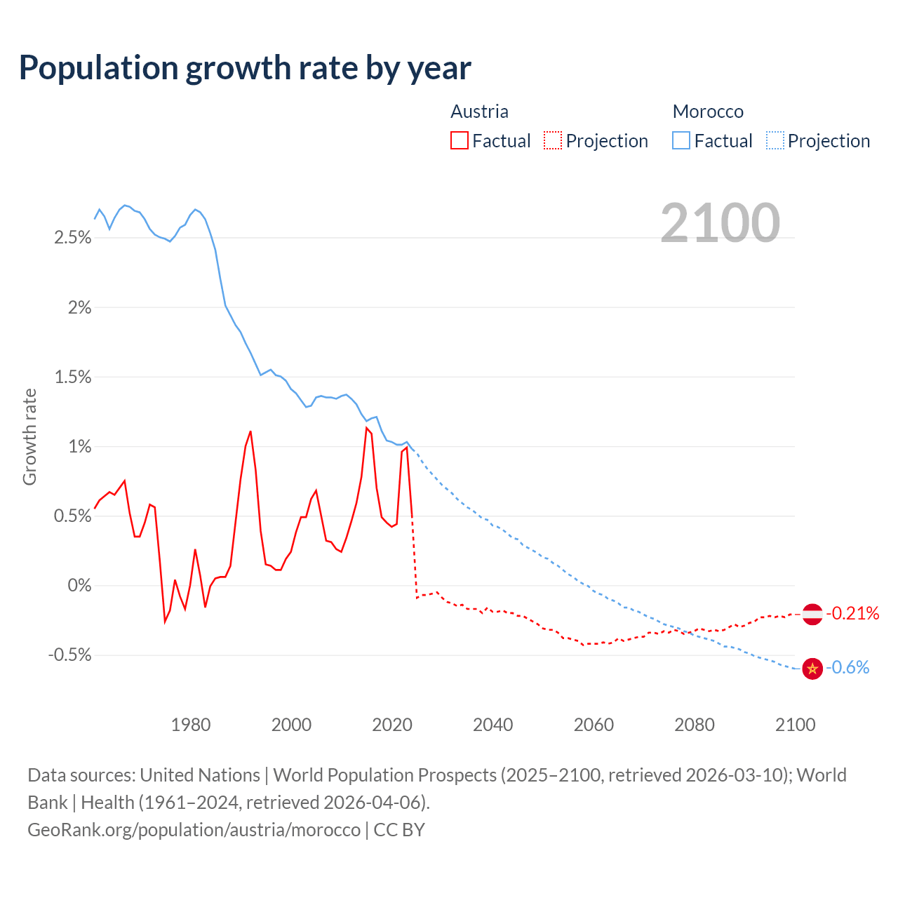 - For the last 10 years, Austria has had an average growth rate of +0.72% per year vs +1.09% in Morocco.