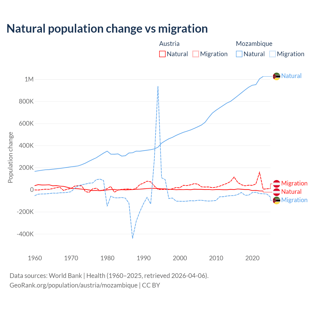 Over the last 10 years, 2.61% of the population change in Austria is from natural causes (a loss of 16,936 people) and 97.4% is from migration (a gain of 631,325 people). In Mozambique 95.9% is from natural causes (a gain of 9,108,203 people) and 4.15% is from migration (a loss of 393,923 people).
