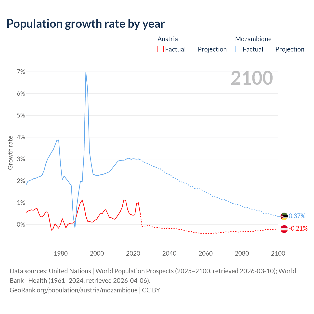 - For the last 10 years, Austria has had an average growth rate of +0.72% per year vs +2.99% in Mozambique.