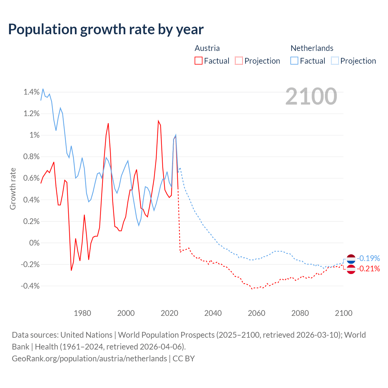 - For the last 10 years, Austria has had an average growth rate of +0.72% per year vs +0.62% in the Netherlands.