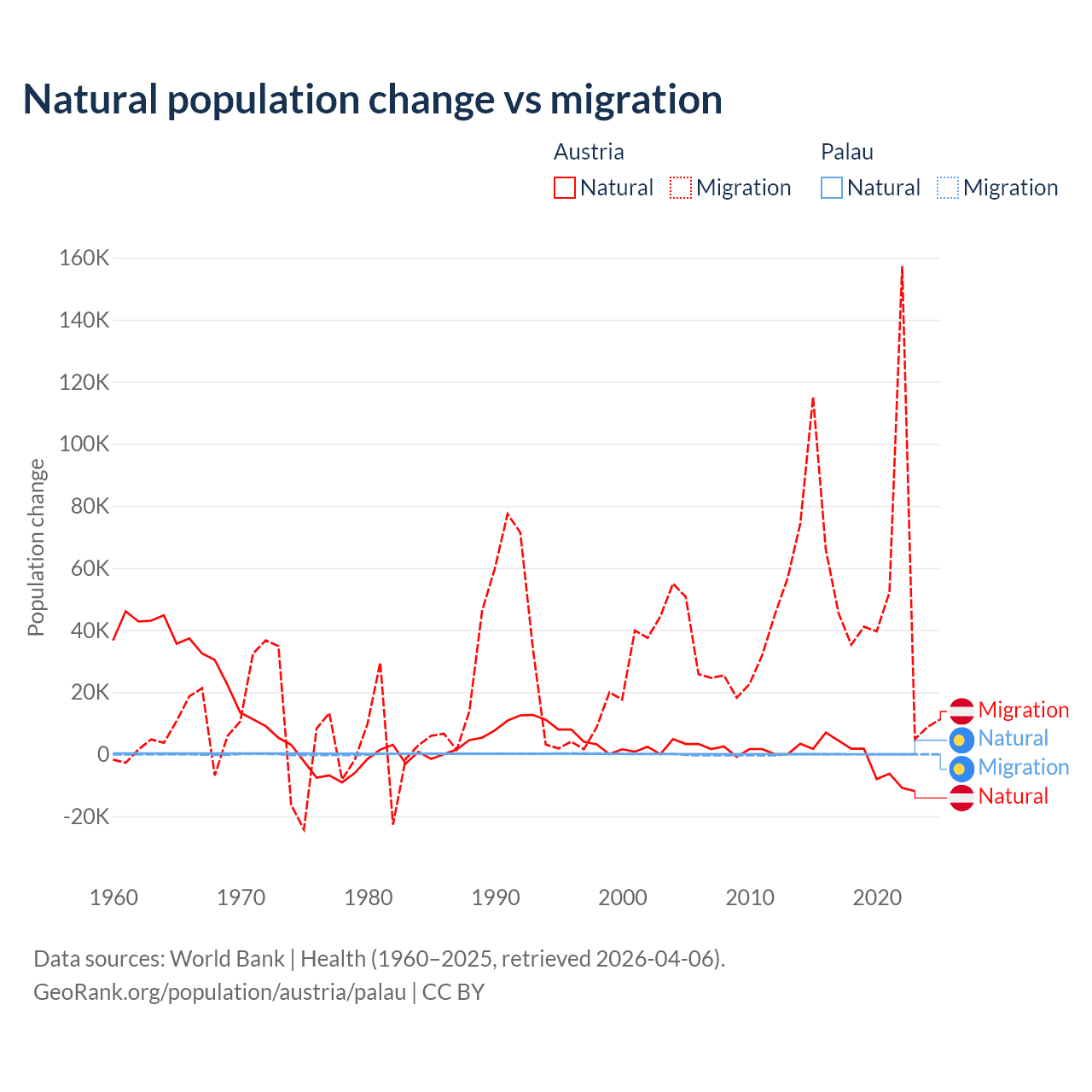 Over the last 10 years, 2.61% of the population change in Austria is from natural causes (a loss of 16,936 people) and 97.4% is from migration (a gain of 631,325 people). In Palau 53.8% is from natural causes (a gain of 264 people) and 46.2% is from migration (a loss of 227 people).
