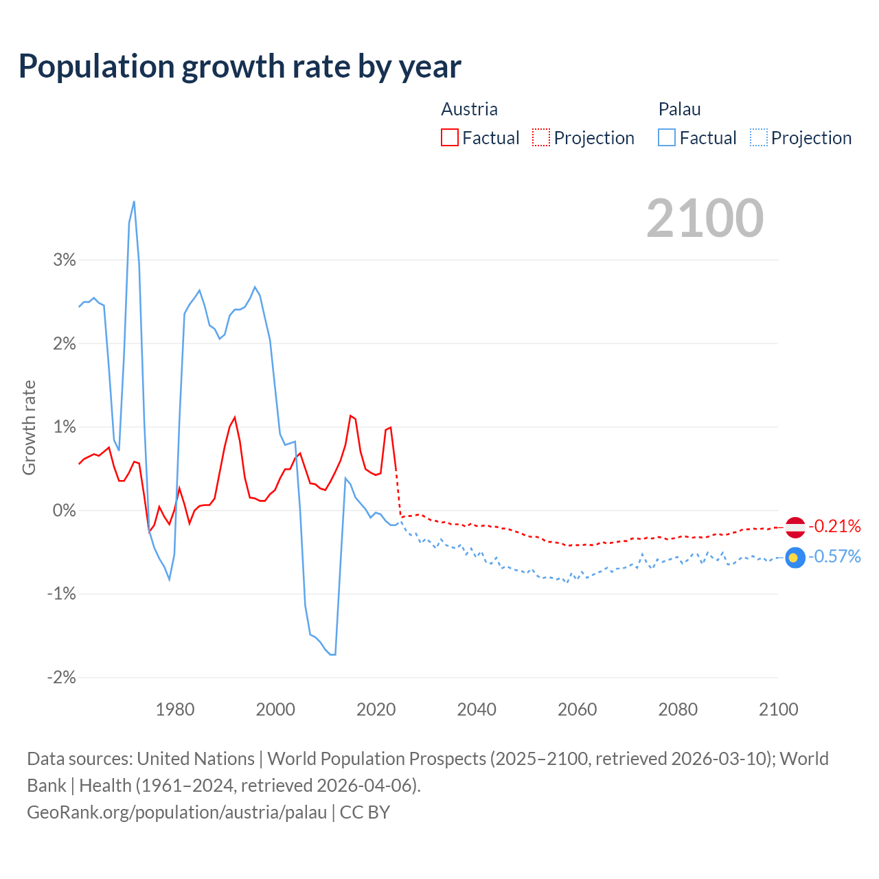 - For the last 10 years, Austria has had an average growth rate of +0.72% per year vs +0.02% in Palau.