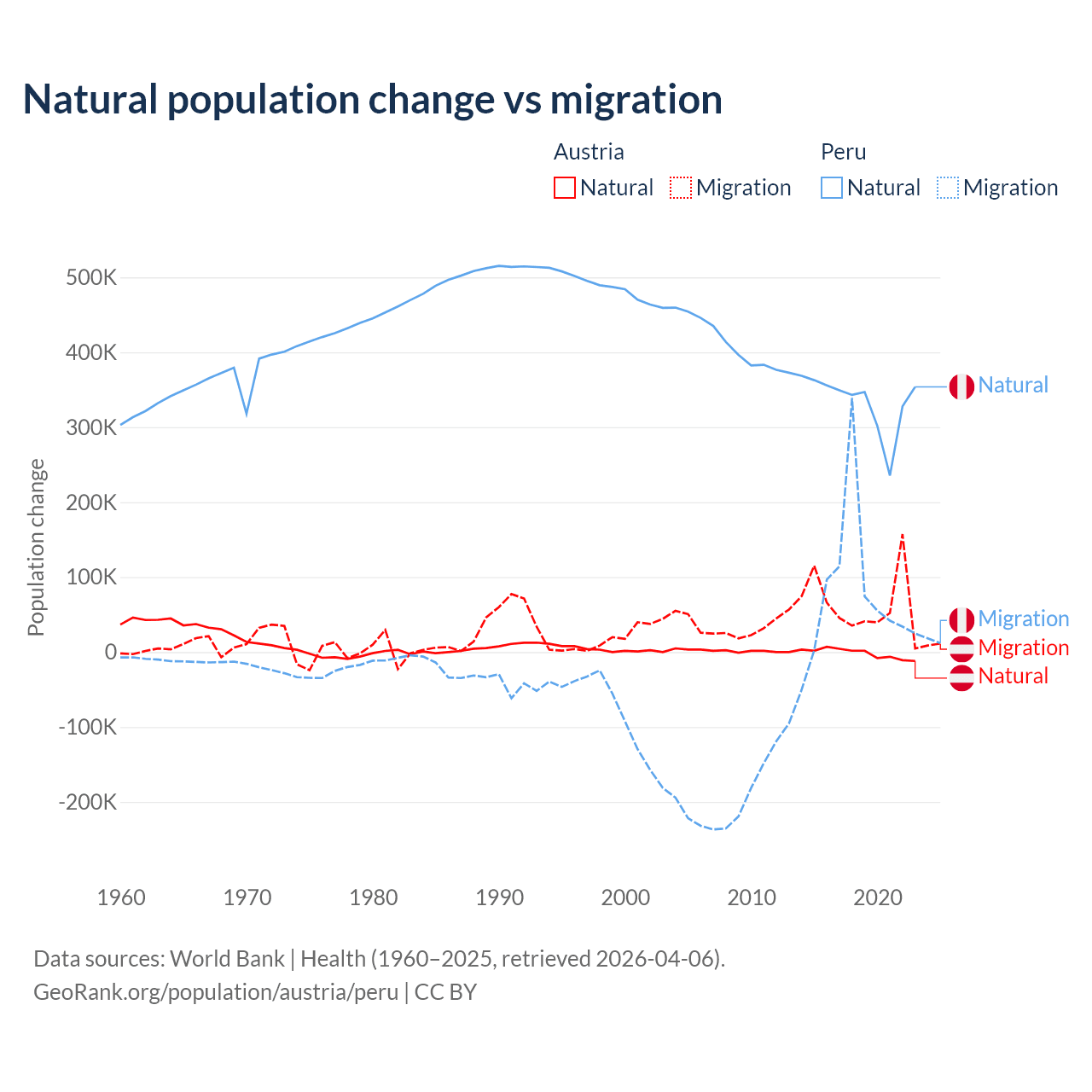 Over the last 10 years, 2.61% of the population change in Austria is from natural causes (a loss of 16,936 people) and 97.4% is from migration (a gain of 631,325 people). In Peru 82% is from natural causes (a gain of 3,345,822 people) and 18% is from migration (a gain of 732,505 people).