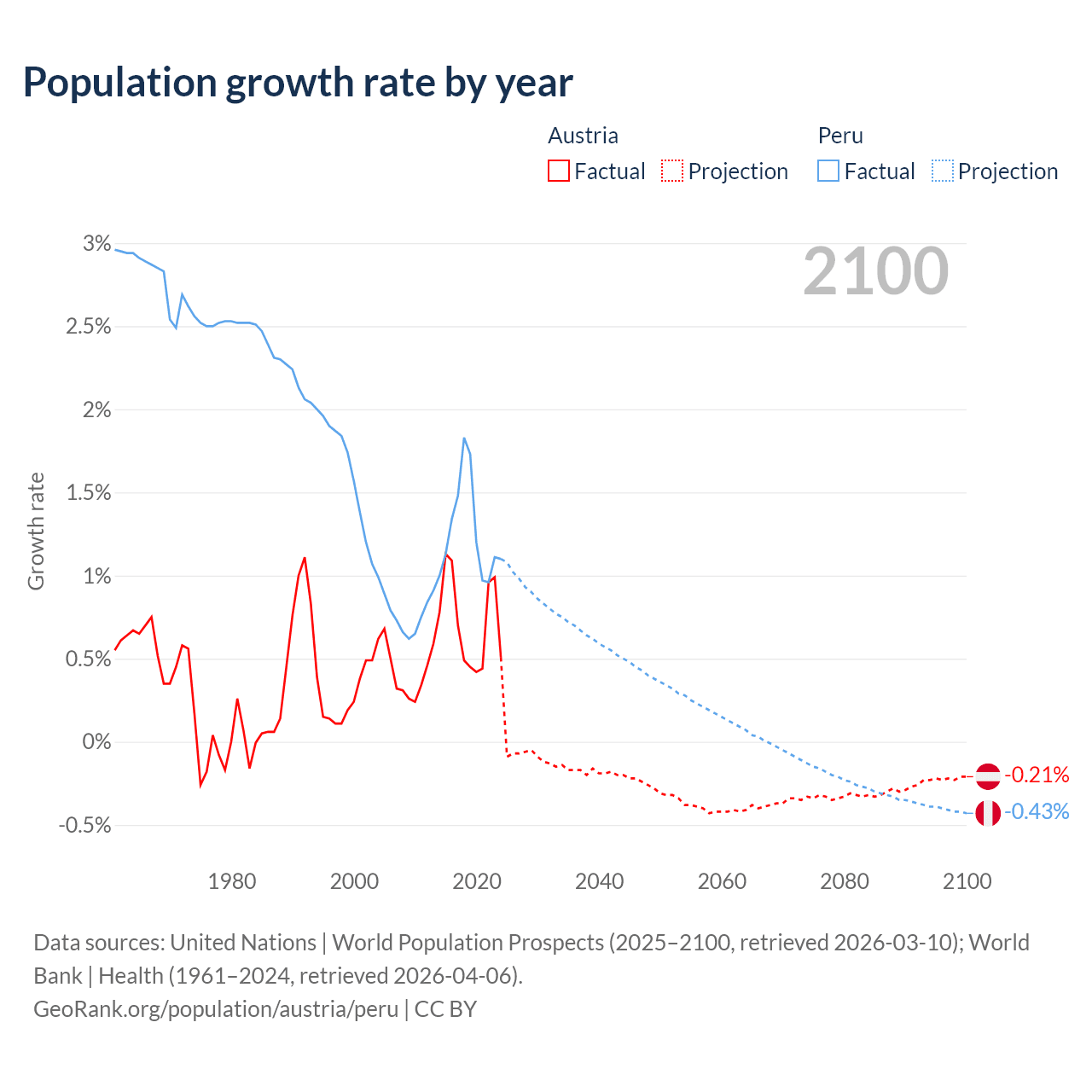 - For the last 10 years, Austria has had an average growth rate of +0.72% per year vs +1.26% in Peru.