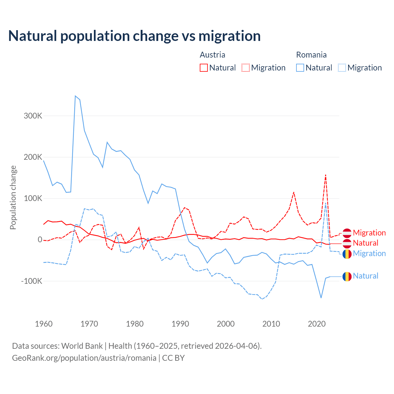 Over the last 10 years, 2.61% of the population change in Austria is from natural causes (a loss of 16,936 people) and 97.4% is from migration (a gain of 631,325 people). In Romania 82% is from natural causes (a loss of 766,295 people) and 18% is from migration (a loss of 167,917 people).