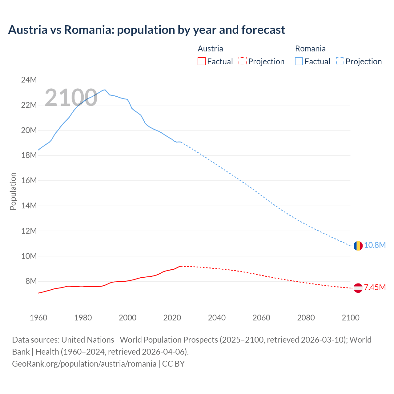 The latest officially reported population of Austria was 9,177,982 in 2024 vs 19,051,804 people in Romania in 2024. In 2026, based on the adjusted UN estimation, the current Austria's population is 9,163,419 people compared to 18,839,108 in Romania.