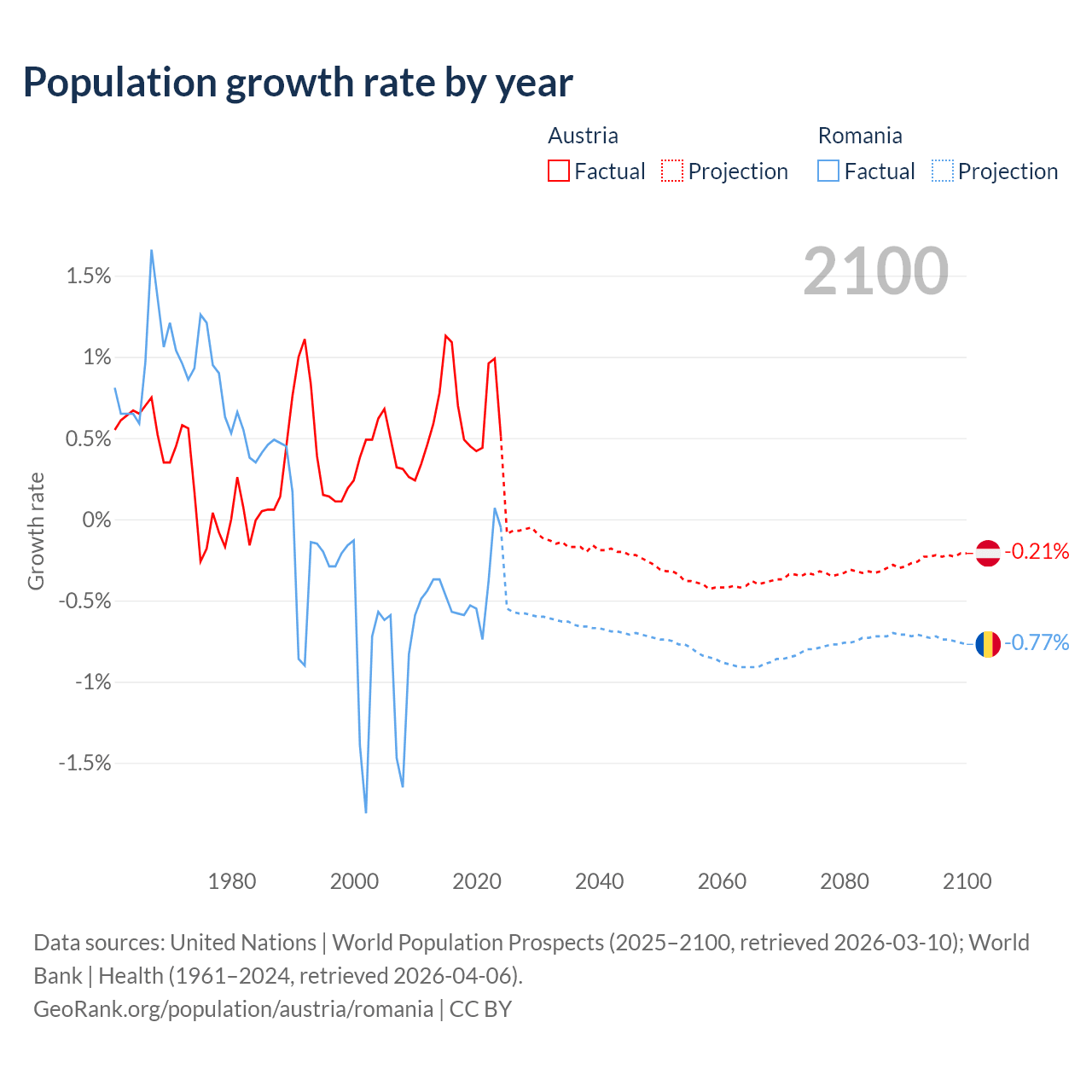 - For the last 10 years, Austria has had an average growth rate of +0.72% per year vs -0.43% in Romania.