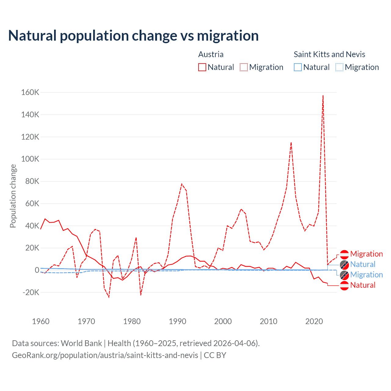 Over the last 10 years, 2.61% of the population change in Austria is from natural causes (a loss of 16,936 people) and 97.4% is from migration (a gain of 631,325 people). In Saint Kitts and Nevis 44.9% is from natural causes (a gain of 1,225 people) and 55.1% is from migration (a loss of 1,506 people).