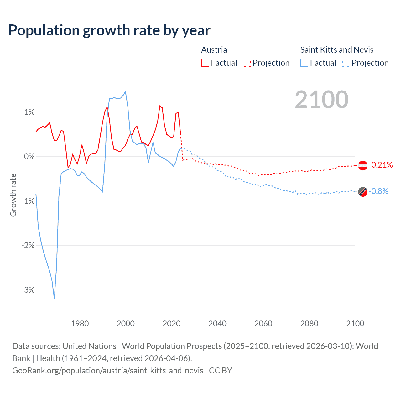 - For the last 10 years, Austria has had an average growth rate of +0.72% per year vs -0.04% in Saint Kitts and Nevis.