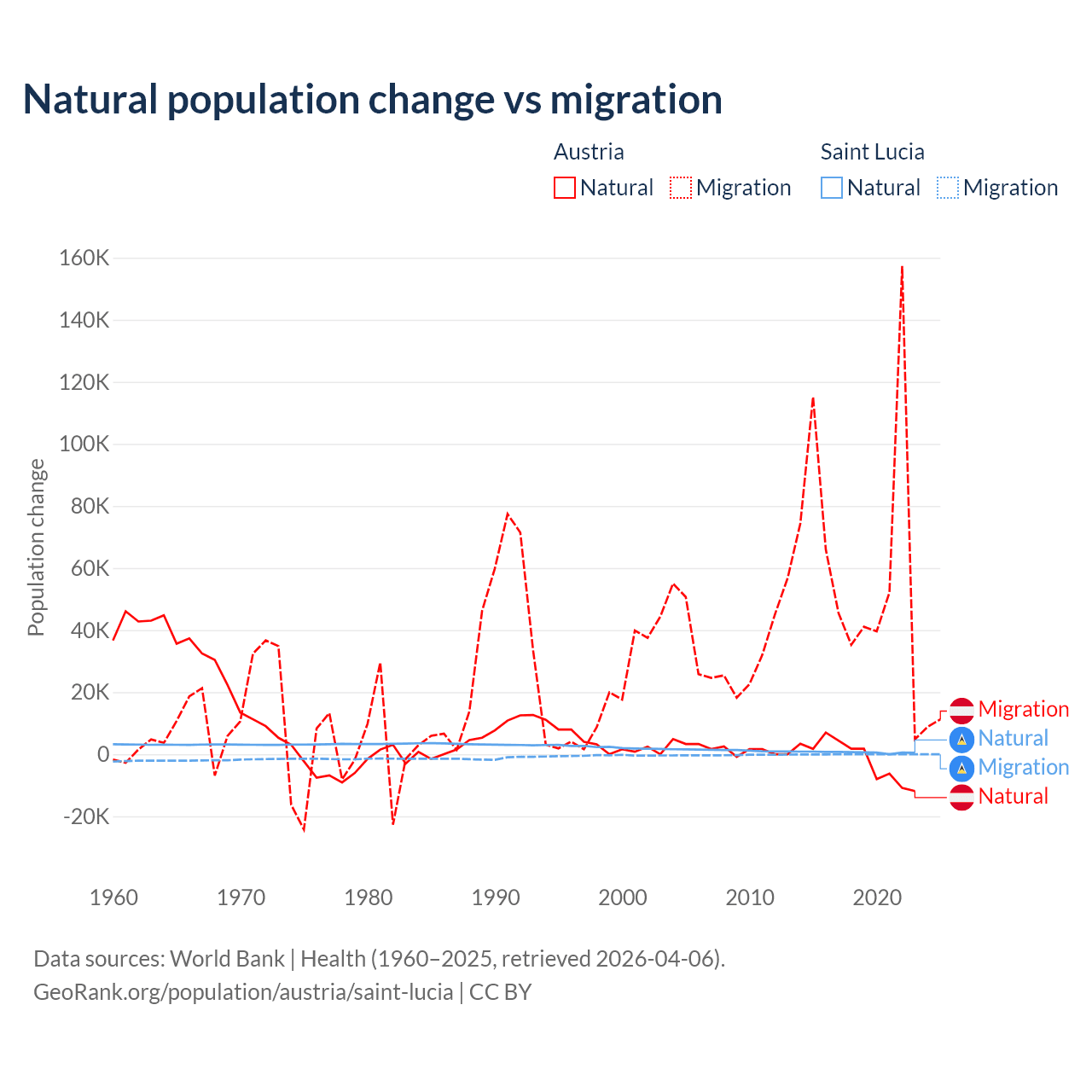 Over the last 10 years, 2.61% of the population change in Austria is from natural causes (a loss of 16,936 people) and 97.4% is from migration (a gain of 631,325 people). In Saint Lucia 95.7% is from natural causes (a gain of 6,039 people) and 4.31% is from migration (a loss of 272 people).