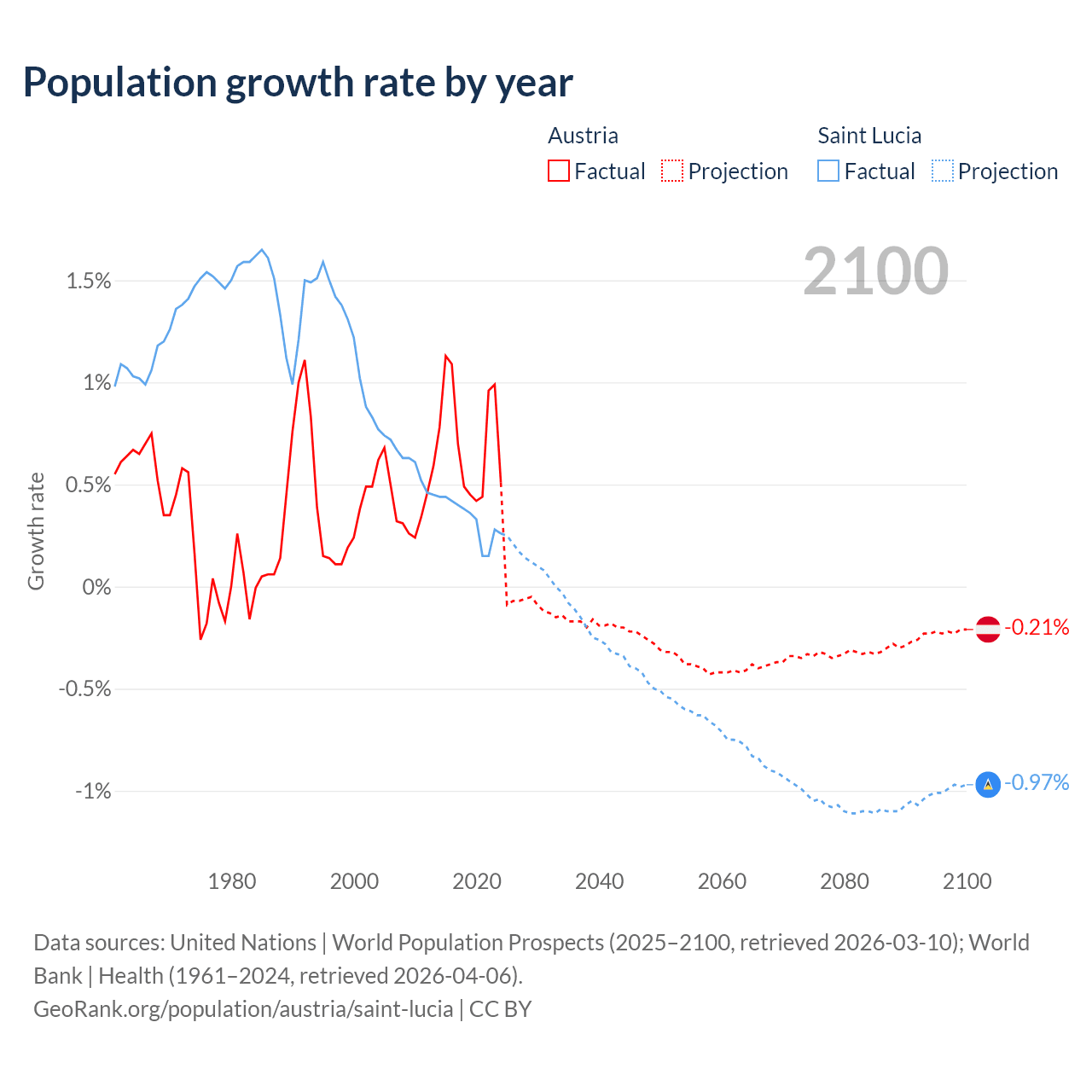 - For the last 10 years, Austria has had an average growth rate of +0.72% per year vs +0.33% in Saint Lucia.