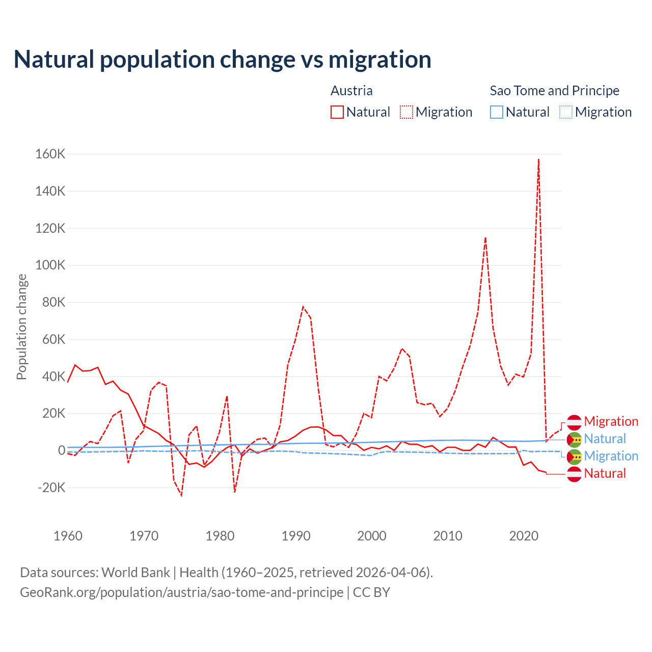 Over the last 10 years, 2.61% of the population change in Austria is from natural causes (a loss of 16,936 people) and 97.4% is from migration (a gain of 631,325 people). In Sao Tome and Principe 80.1% is from natural causes (a gain of 50,822 people) and 19.9% is from migration (a loss of 12,621 people).