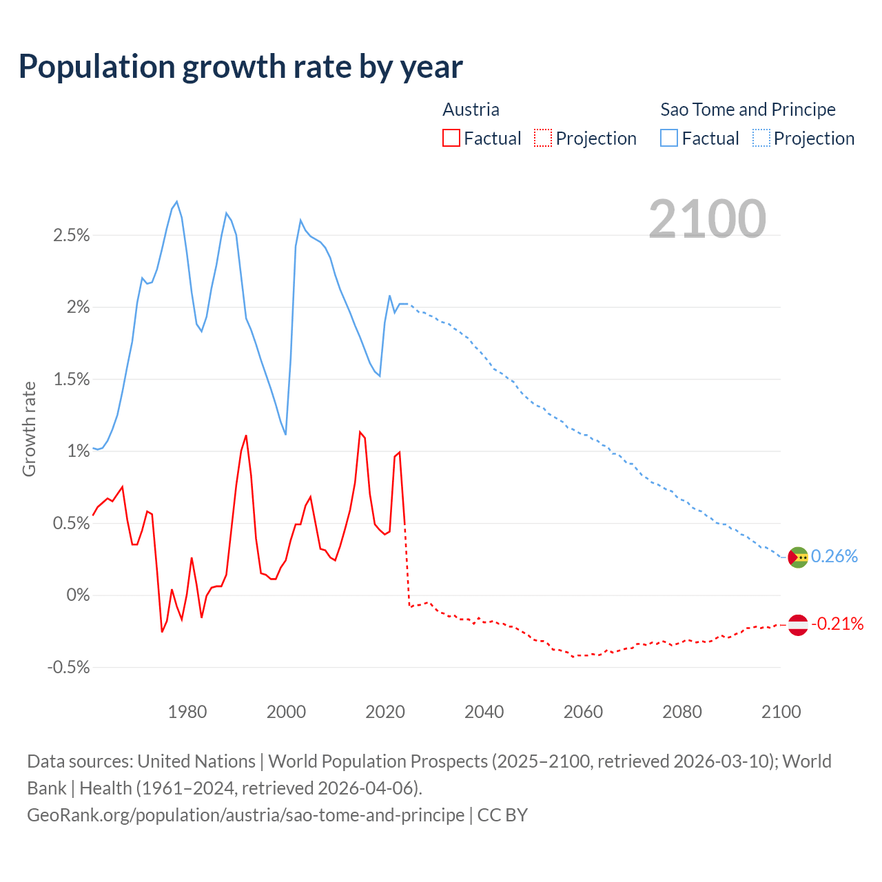 - For the last 10 years, Austria has had an average growth rate of +0.72% per year vs +1.82% in Sao Tome and Principe.