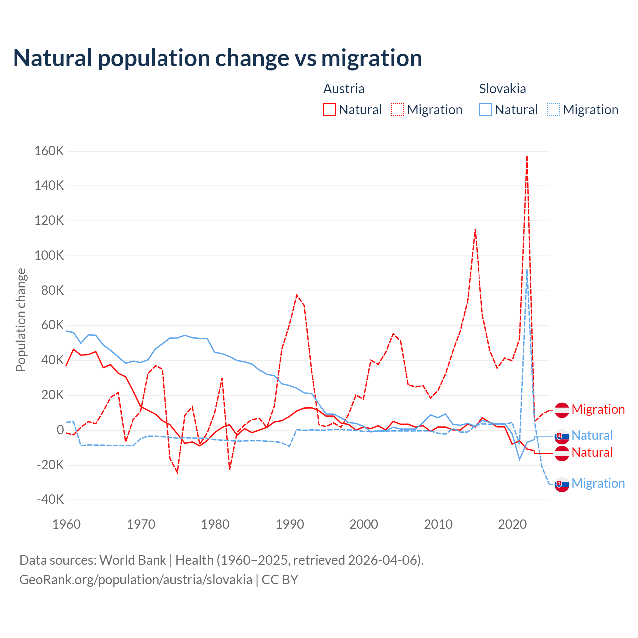 Over the last 10 years, 2.61% of the population change in Austria is from natural causes (a loss of 16,936 people) and 97.4% is from migration (a gain of 631,325 people). In Slovakia 7.47% is from natural causes (a loss of 8,728 people) and 92.5% is from migration (a gain of 108,156 people).
