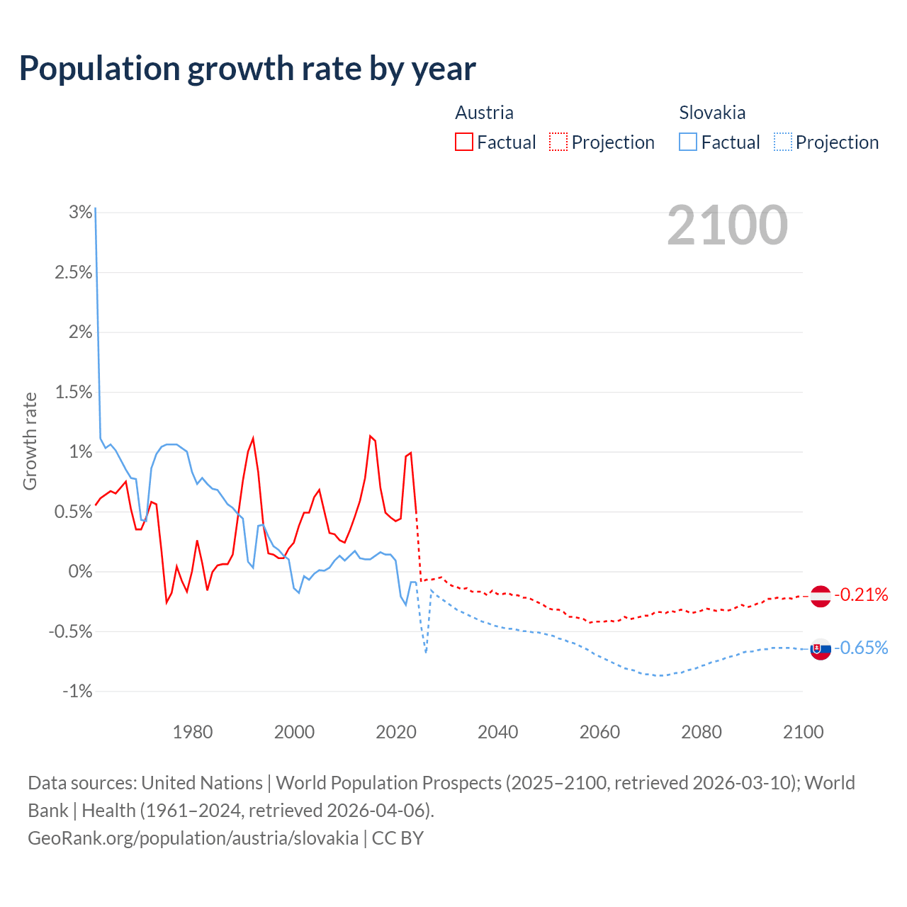 - For the last 10 years, Austria has had an average growth rate of +0.72% per year vs +0.01% in Slovakia.