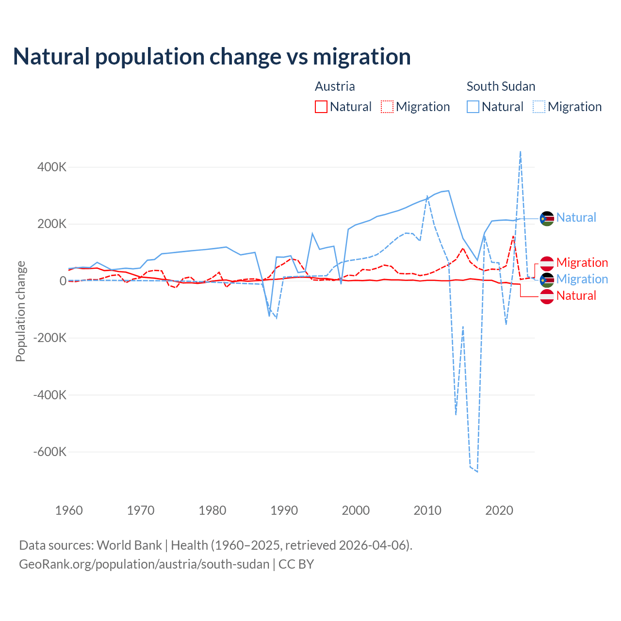 Over the last 10 years, 2.61% of the population change in Austria is from natural causes (a loss of 16,936 people) and 97.4% is from migration (a gain of 631,325 people). In South Sudan 57.4% is from natural causes (a gain of 1,792,135 people) and 42.6% is from migration (a loss of 1,329,606 people).
