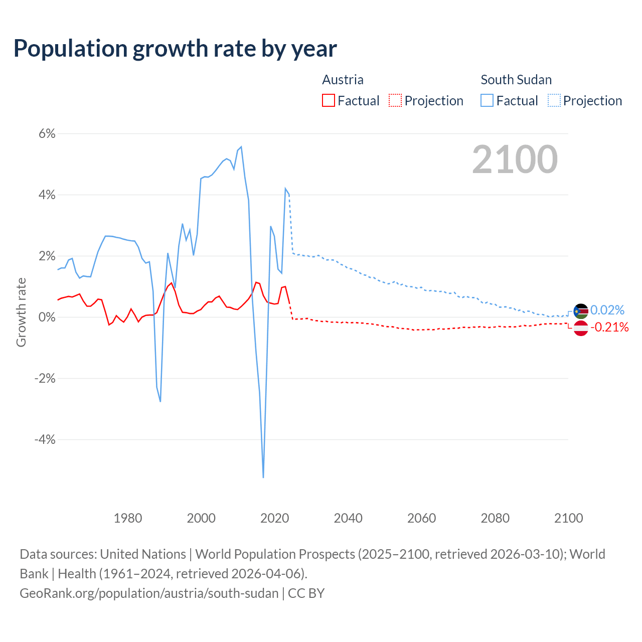 - For the last 10 years, Austria has had an average growth rate of +0.72% per year vs +0.65% in South Sudan.