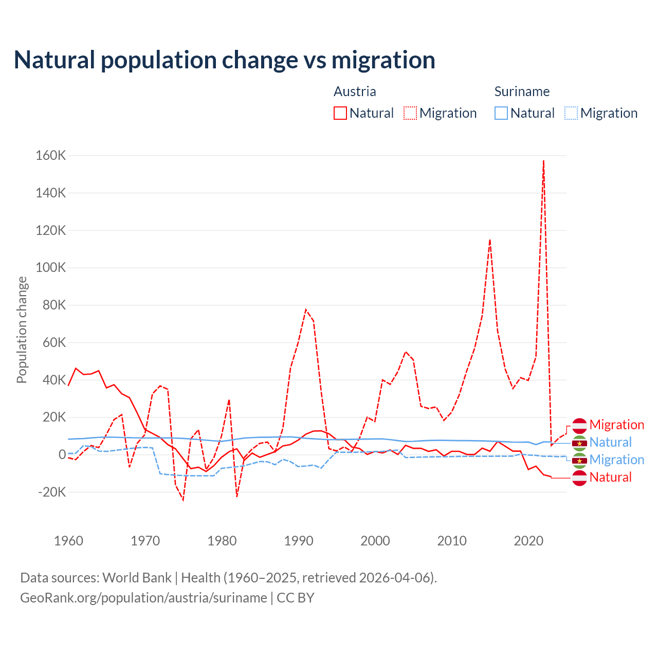 Over the last 10 years, 2.61% of the population change in Austria is from natural causes (a loss of 16,936 people) and 97.4% is from migration (a gain of 631,325 people). In Suriname 90.3% is from natural causes (a gain of 66,709 people) and 9.72% is from migration (a loss of 7,185 people).