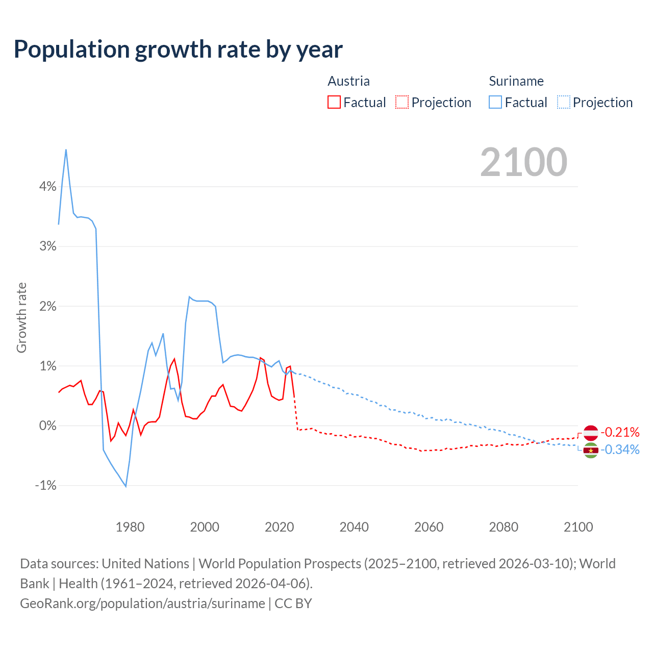 - For the last 10 years, Austria has had an average growth rate of +0.72% per year vs +0.99% in Suriname.