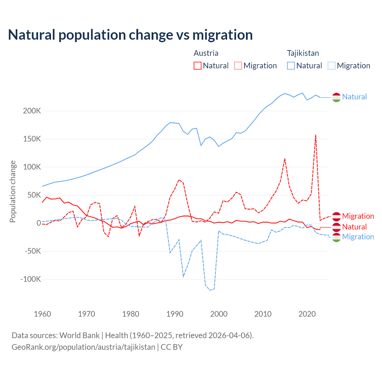 Over the last 10 years, 2.61% of the population change in Austria is from natural causes (a loss of 16,936 people) and 97.4% is from migration (a gain of 631,325 people). In Tajikistan 96% is from natural causes (a gain of 2,266,045 people) and 3.95% is from migration (a loss of 93,205 people).