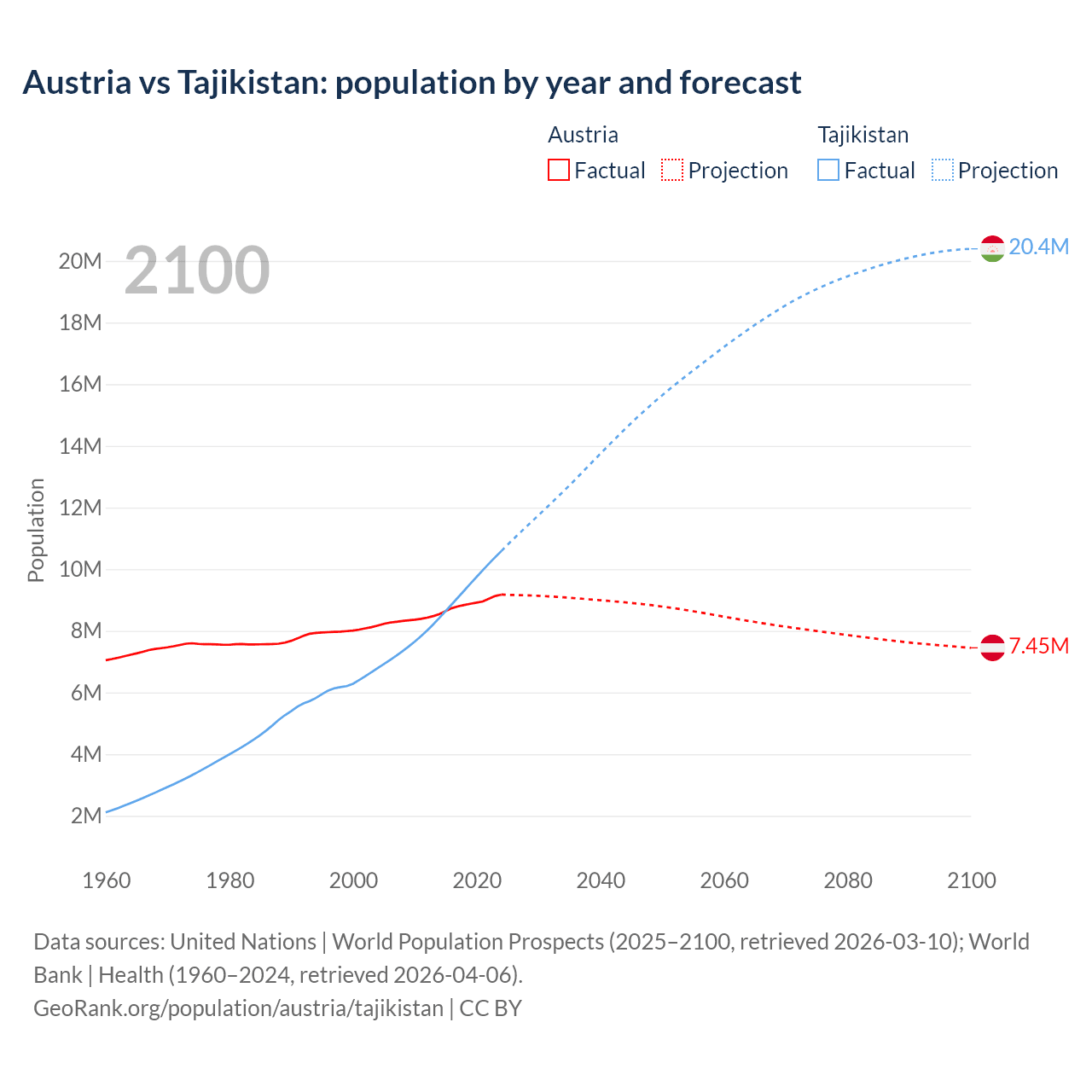 The latest officially reported population of Austria was 9,177,982 in 2024 vs 10,590,927 people in Tajikistan in 2024. In 2026, based on the adjusted UN estimation, the current Austria's population is 9,163,419 people compared to 11,038,274 in Tajikistan.