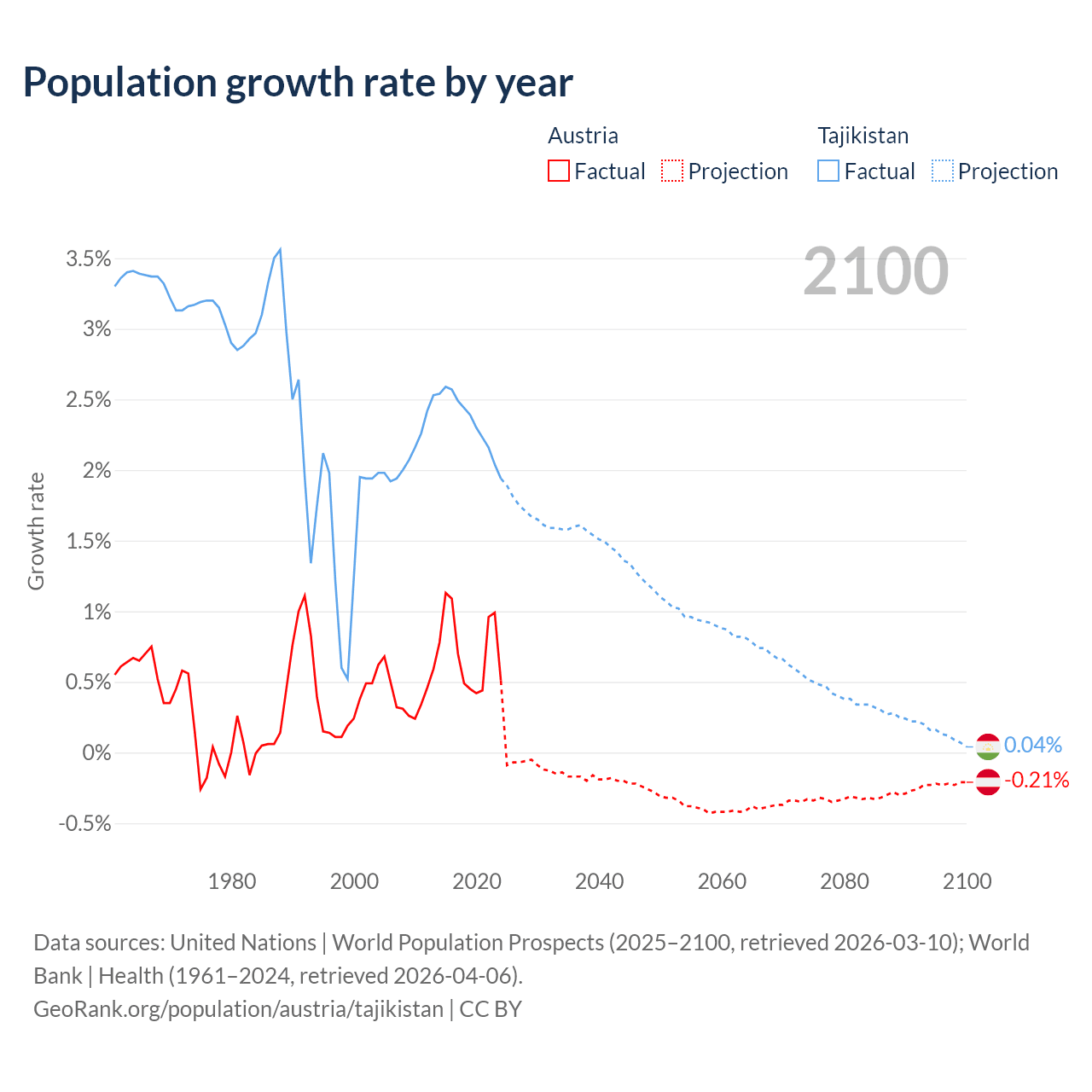 - For the last 10 years, Austria has had an average growth rate of +0.72% per year vs +2.33% in Tajikistan.