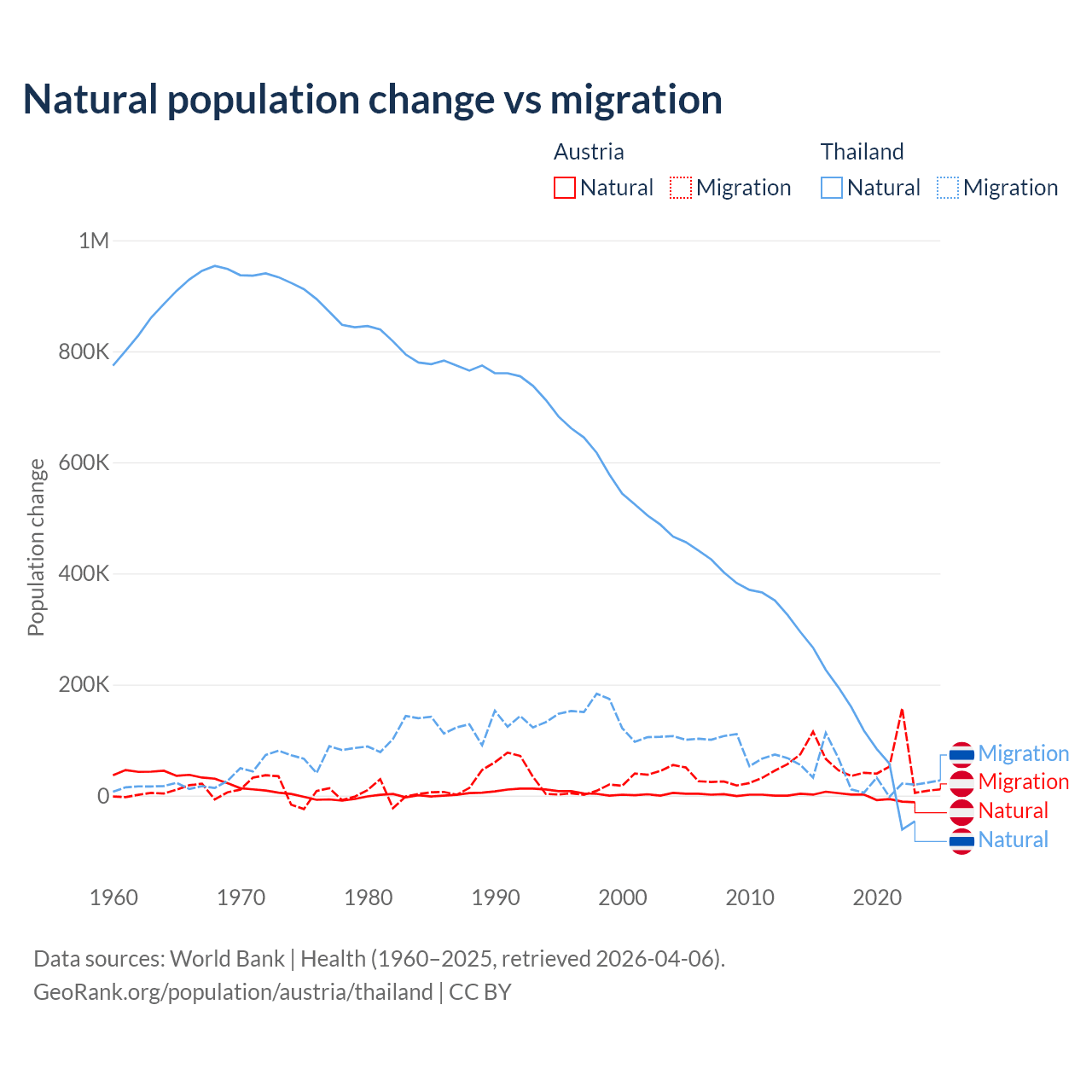 Over the last 10 years, 2.61% of the population change in Austria is from natural causes (a loss of 16,936 people) and 97.4% is from migration (a gain of 631,325 people). In Thailand 78.4% is from natural causes (a gain of 1,292,528 people) and 21.6% is from migration (a gain of 355,361 people).