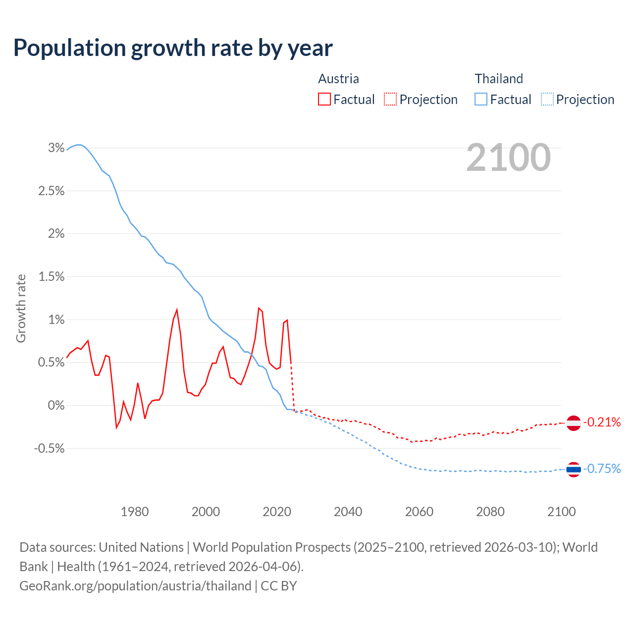 - For the last 10 years, Austria has had an average growth rate of +0.72% per year vs +0.23% in Thailand.