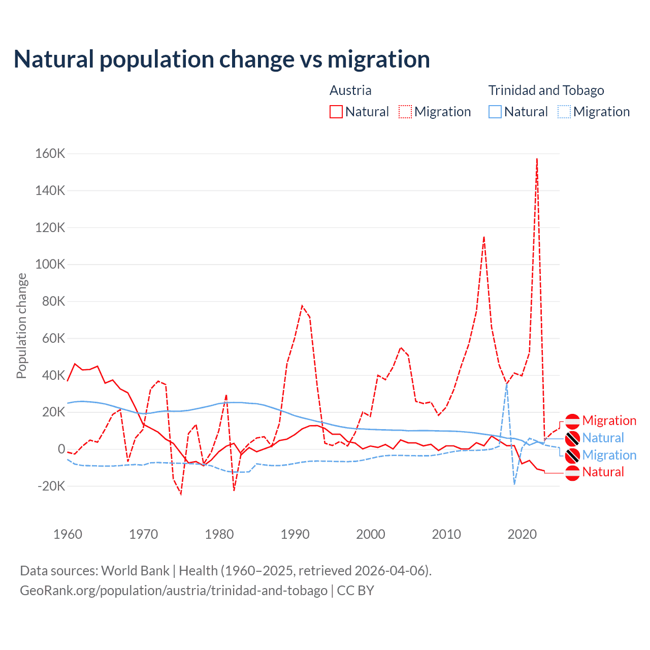 Over the last 10 years, 2.61% of the population change in Austria is from natural causes (a loss of 16,936 people) and 97.4% is from migration (a gain of 631,325 people). In Trinidad and Tobago 66% is from natural causes (a gain of 55,887 people) and 34% is from migration (a gain of 28,785 people).