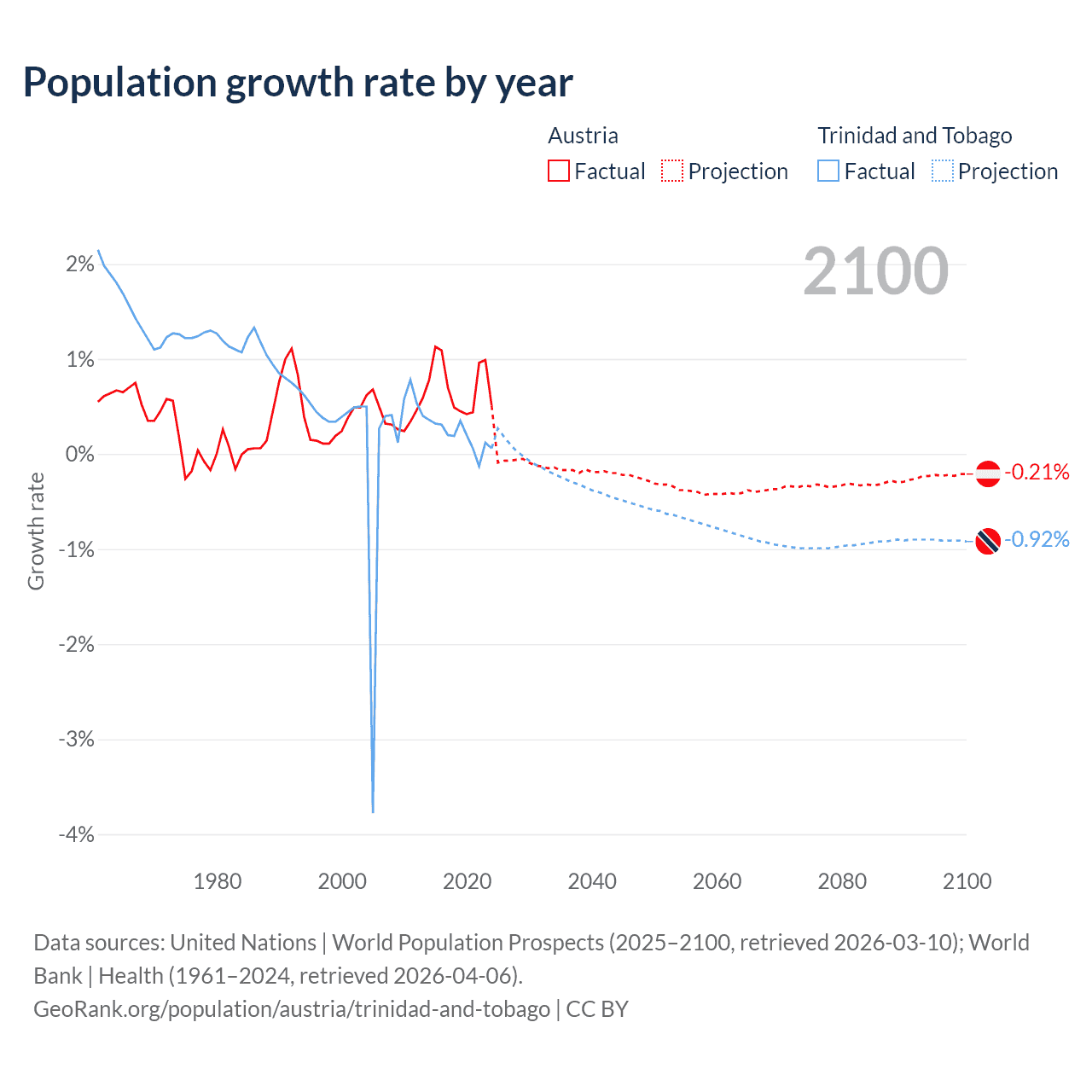 - For the last 10 years, Austria has had an average growth rate of +0.72% per year vs +0.19% in Trinidad and Tobago.