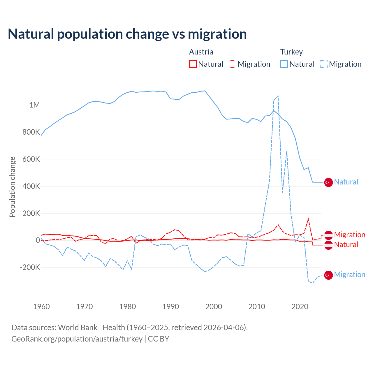 Over the last 10 years, 2.61% of the population change in Austria is from natural causes (a loss of 16,936 people) and 97.4% is from migration (a gain of 631,325 people). In Turkey 73% is from natural causes (a gain of 7,333,352 people) and 27% is from migration (a gain of 2,718,916 people).